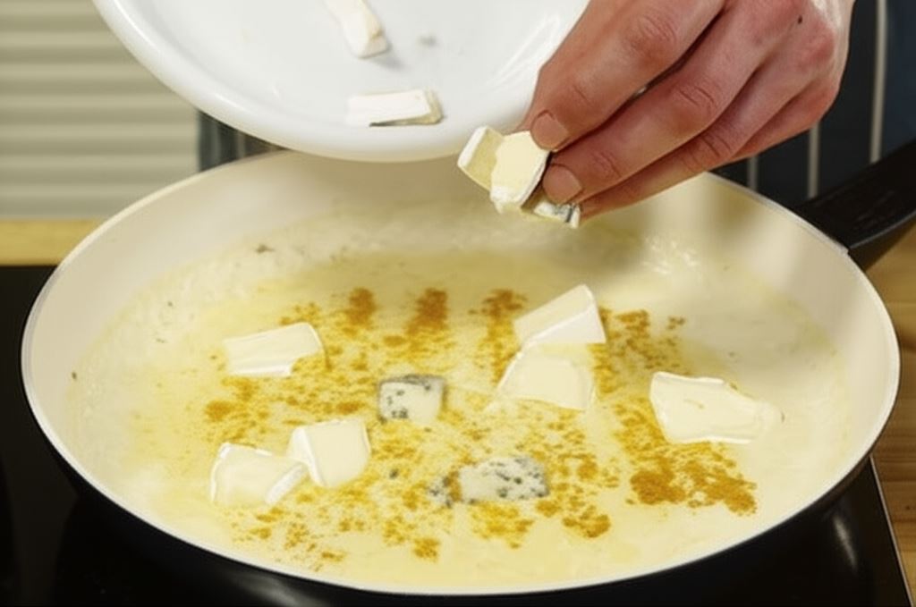 Teraz zredukuj ogień i dodaj do sosu pokruszone sery w odpowiednich proporcjach: brie, starty parmezan, ser z niebieską pleśnią, oraz gruyère lub ementaler. Mieszaj, dopóki całkowicie się nie rozpuszczą. Wsyp do mieszaniny szczyptę kurkumy i świeżo mielony pieprz. Ponownie zamieszaj.
