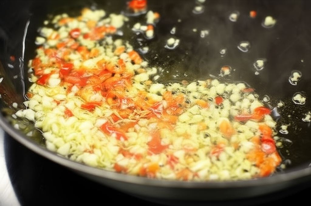 Na desce kuchennej posiekaj drobniutko papryczkę chili i czosnek. Na patelni podgrzej dwie łyżki oliwy i wsyp warzywa. Smaż na małym ogniu aż do momentu, gdy czosnek delikatnie się zrumieni.