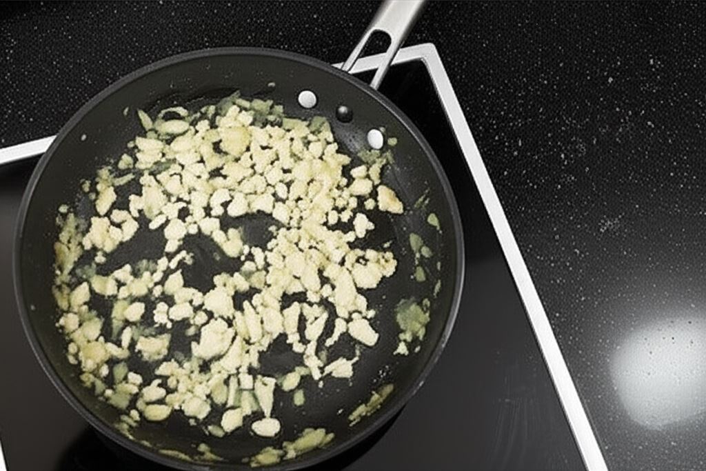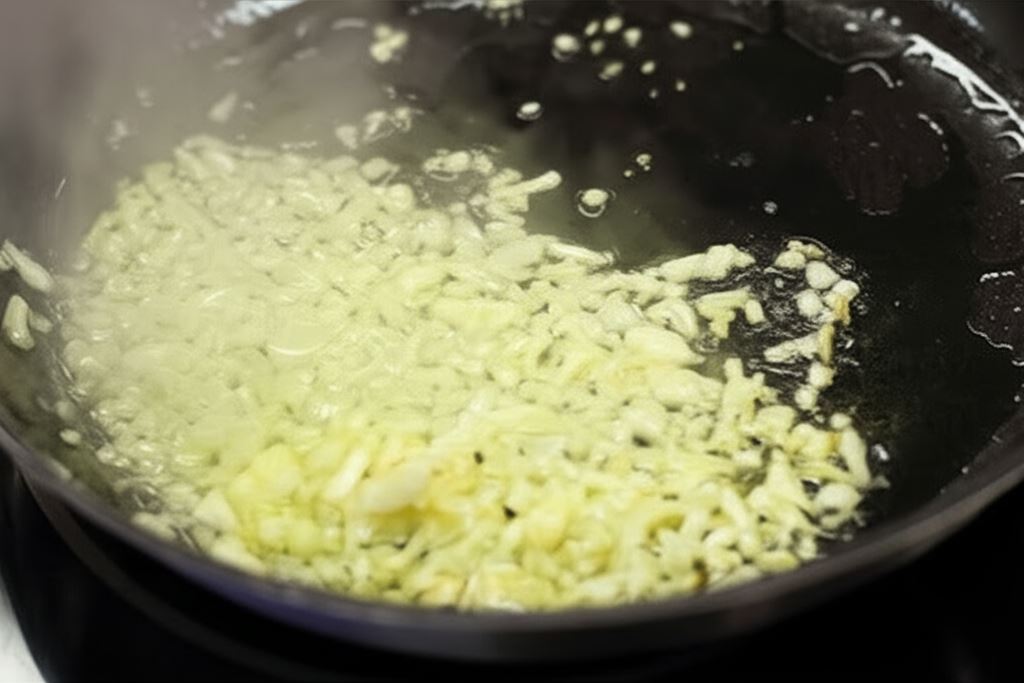 W międzyczasie na patelni podgrzej oliwę i zrumień posiekany czosnek i cebulę.
