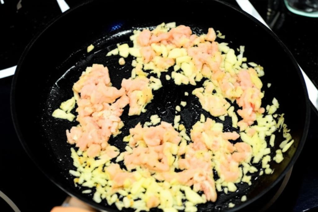 Wsyp zmielone mięso indycze i smaż przez kilka minut, ciągle mieszając, by mięso nie utworzyło grudek.