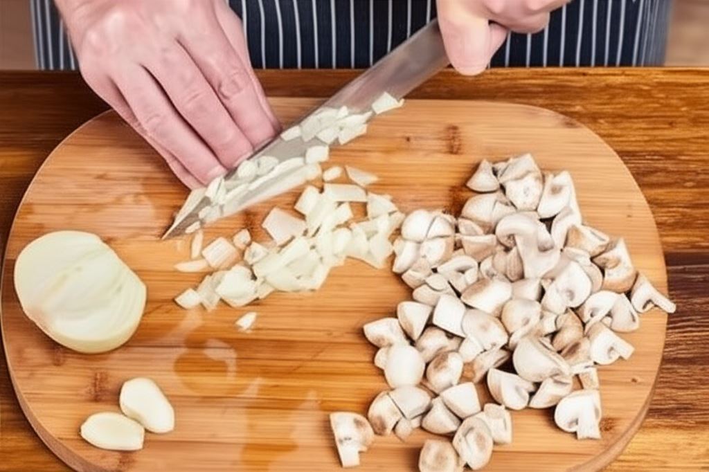 Pieczarki opłucz i podziel na 4 części, większe na 6, cebulę i czosnek obierz i drobno posiekaj,