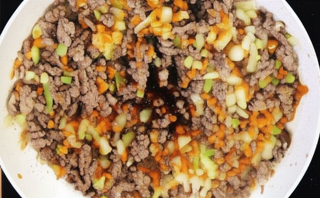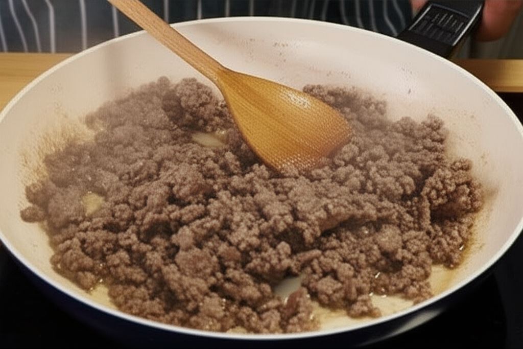 Umieść mięso mielone na patelni. Smaż na dużym ogniu aż lekko zbrązowieje.