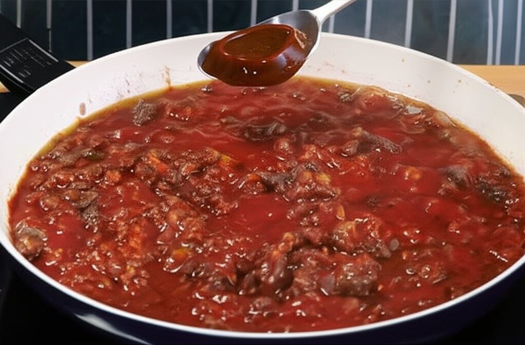 Dodaj sos pomidorowy, wsyp Bulionetkę wołową Knorr oraz przyprawy. Całość starannie zamieszaj i gotuj na niskim ogniu przez około 30 minut.