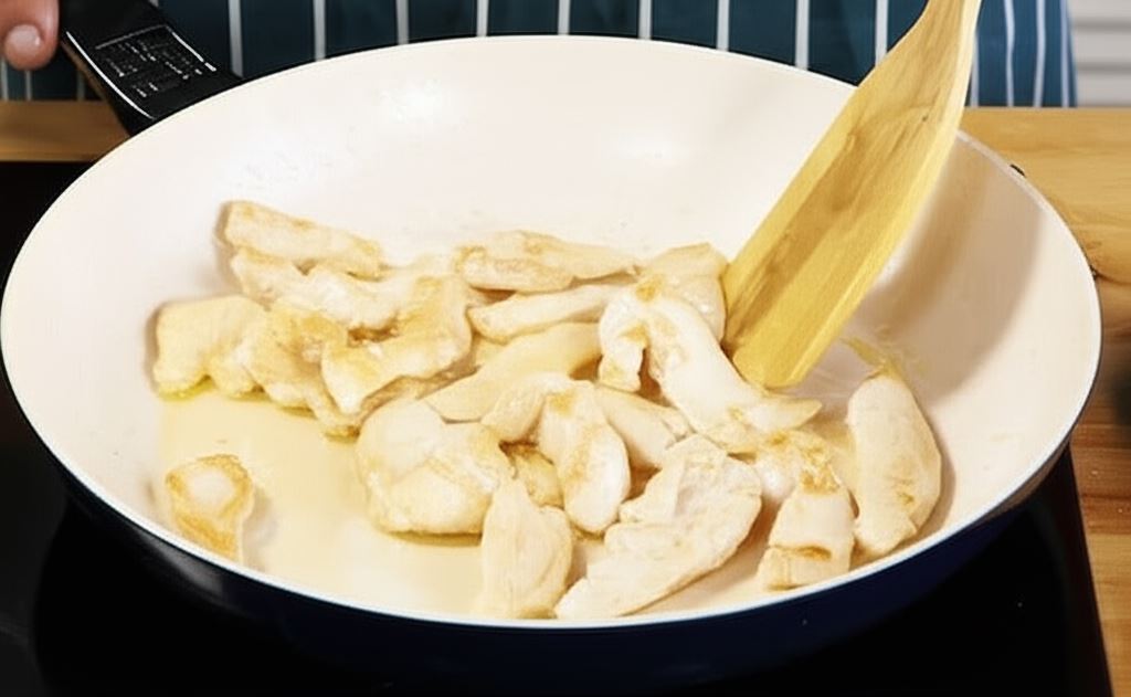 Mięso pokrój w paski, obtocz w mące ziemniaczanej i zrumień na szerokiej patelni albo woku.