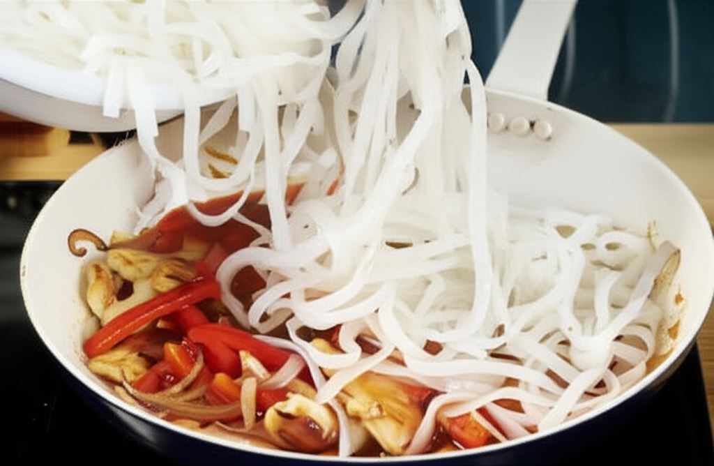 Makaron ryżowy nie wymaga gotowania – wystarczy zalać go ciepłą wodą na kilka minut. Jest lekkostrawny i nie zawiera glutenu, co czyni go świetną alternatywą dla tradycyjnego makaronu pszennego. W kuchni chińskiej najczęściej używa się płaskich wstążek przypominających włoskie tagliatelle, które doskonale komponują się z sosami.