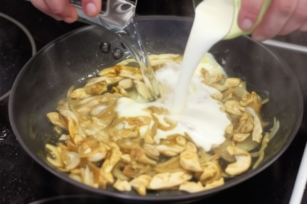 Do przysmażonego kurczaka dodaj śmietanę i pół szklanki wody.