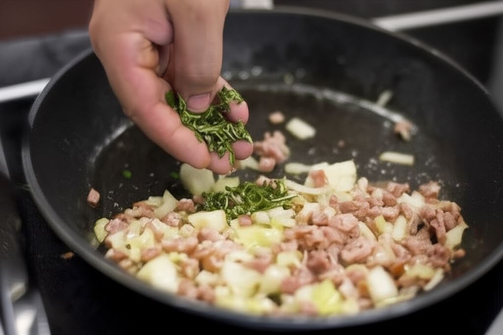 Boczek i cebulę posiekaj w kostkę. Czosnek przepuść przez praskę. Potem zrumień wszystko razem na rozgrzanej oliwie. Dodaj posiekane zioła.