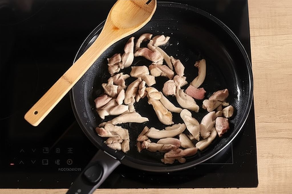 Na patelni podgrzej olej i zrumień mięso pocięte w paski.