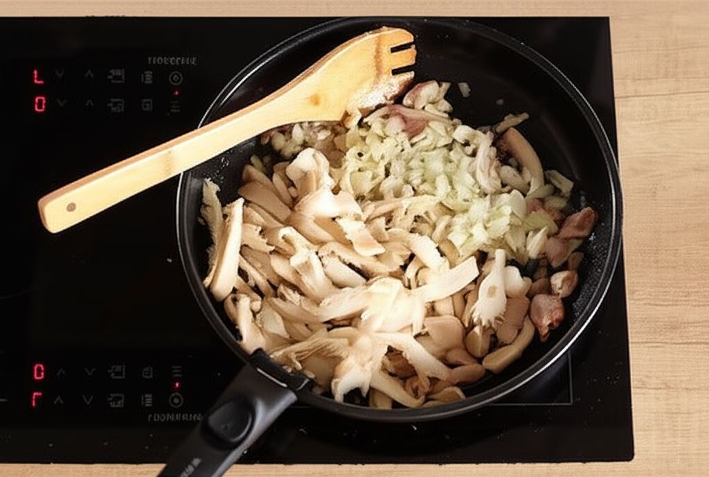 Posiekaj czosnek, cebulę i boczniaki. Potem wrzuć do mięsa. Kontynuuj smażenie przez kilka minut.
