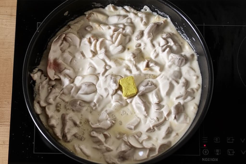 Gdy wszystko się zrumieni, wlej śmietanę, dodaj kostkę bulionu warzywnego Knorr oraz musztardę.