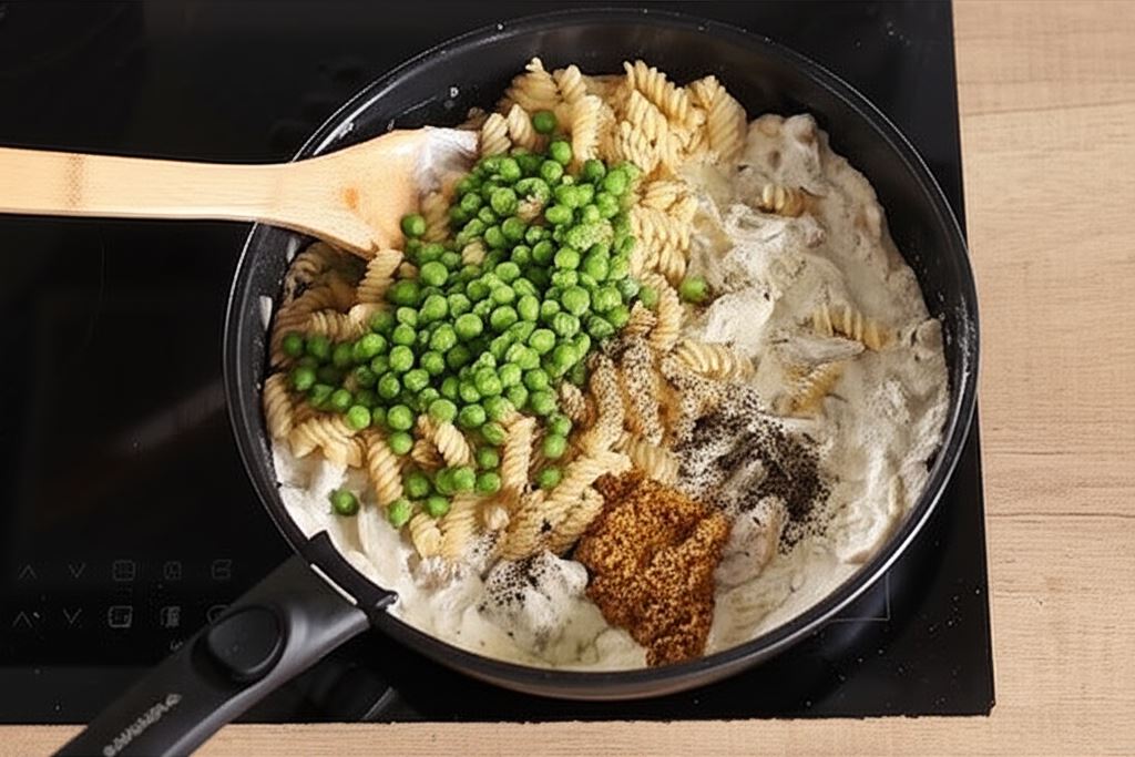 Wsyp ugotowany makaron, groszek i tymianek. Całość duś, dopóki wszystkie składniki się połączą i sos zgęstnieje.