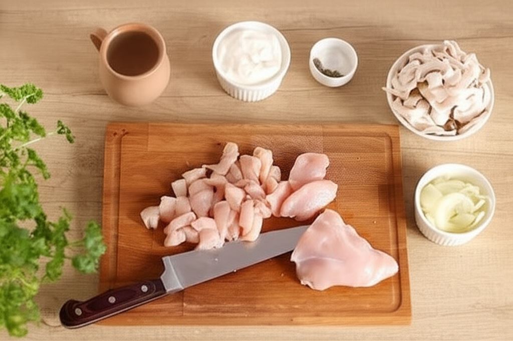 Piersi potnij w kostkę 1x1 cm, cebulę w krążki, a pieczarki w ćwiartki.