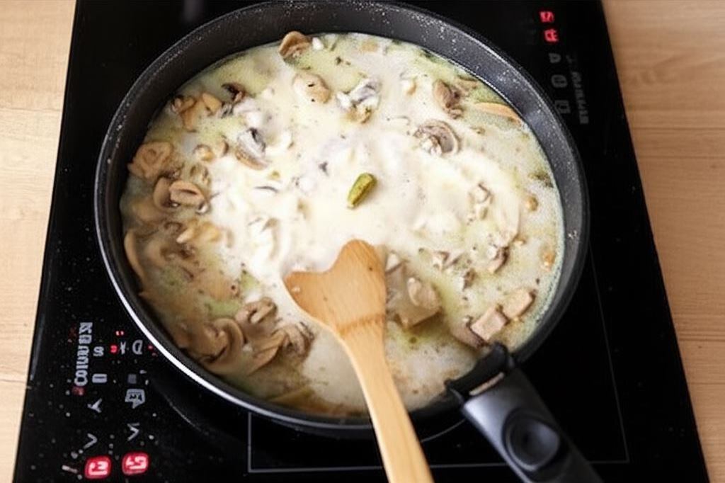 Wlej śmietanę i 300 ml zimnej wody. Przypraw całość kostką Bulionu warzywnego Knorr i gotuj przez około 5 minut, dopóki sos nie zgęstnieje.