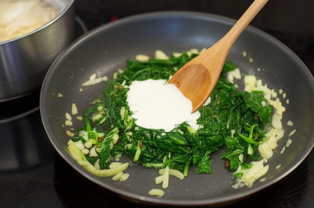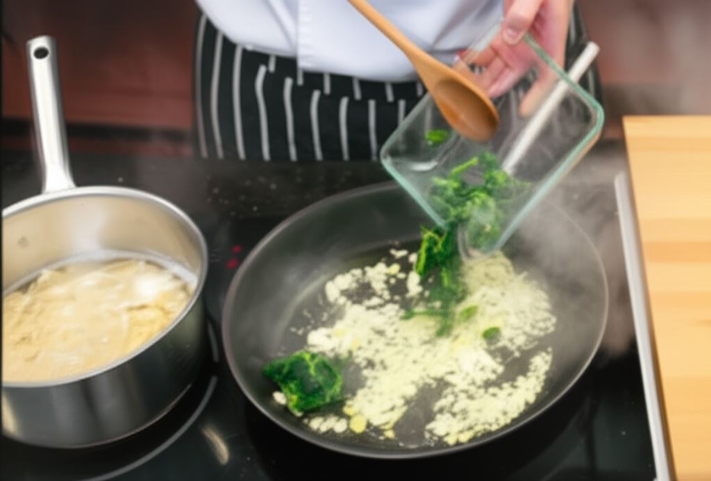 Na patelni zrumień posiekany czosnek i cebulę. Gdy się zarumienią dodaj szpinak. Makaron przygotuj według instrukcji na opakowaniu.