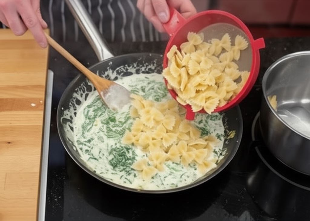 Wrzuć ugotowany makaron do sosu. Gotuj moment aż sos stanie się kremowy. Serwuj od razu po przyrządzeniu.