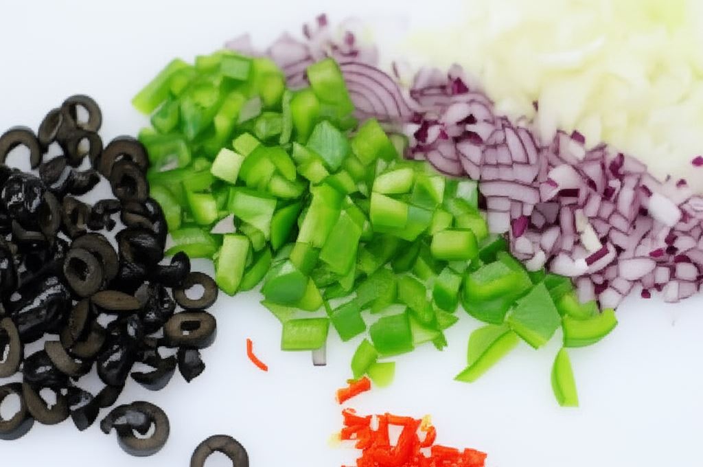 Posiekaj cebulę, paprykę, chilli i czosnek na drobną kostkę, a oliwki na plasterki.