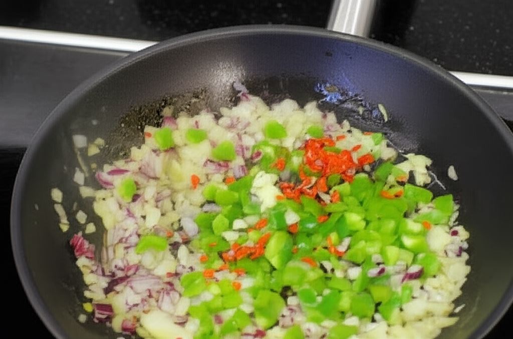 Zrumień cebulę na gorącej oliwie. Wsyp paprykę, chilli i czosnek, następnie duś pod pokrywką przez około 5 minut.