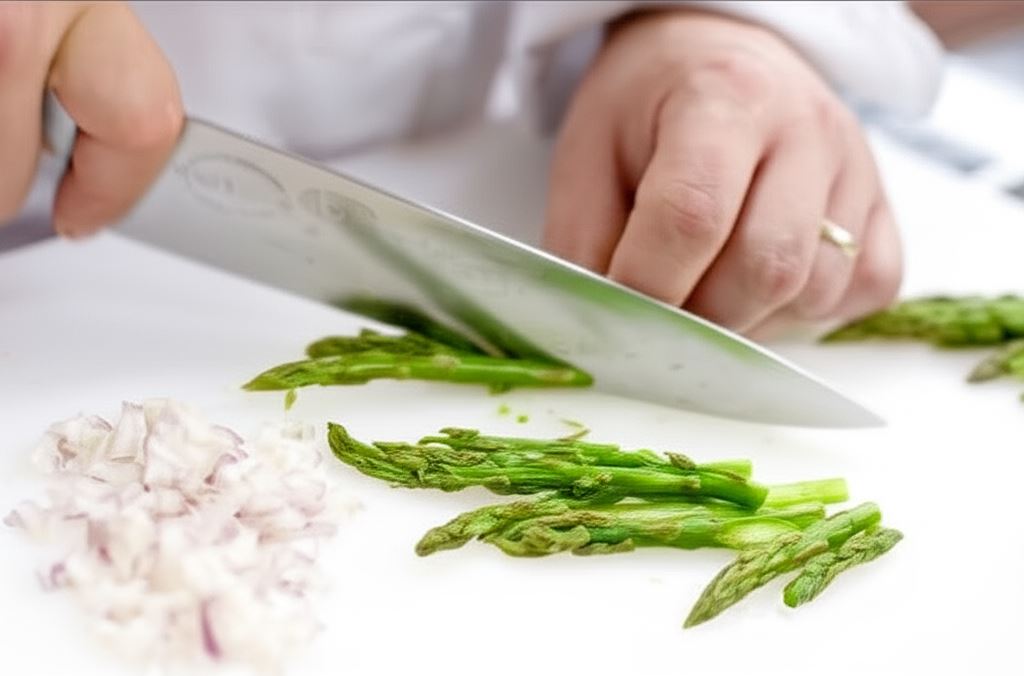 Szparagi potnij na plastry, cebule pokrój w kostkę.