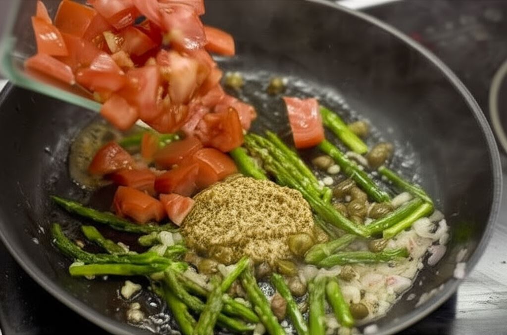 Na patelni zrumień na oliwie szalotki, wsyp kapary, szparagi, sok z cytryny, musztardę i dwa pomidory wcześniej pokrojone w kostkę.