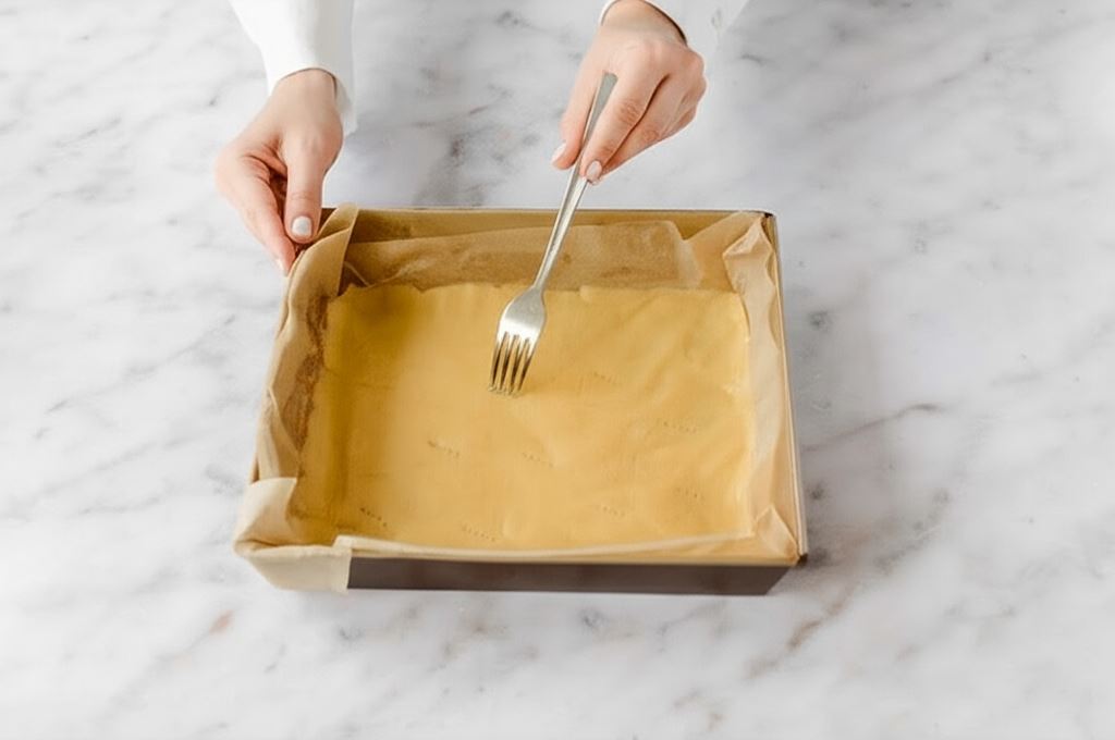 Mąkę z proszkiem przesiewamy do miski. Dodajemy żółtka, masło pokrojone w kostkę oraz cukier puder. Całość zagniatamy na jednolite ciasto. Formujemy z niego kulę i umieszczamy na 30 min. w lodówce. Formę wykładamy papierem do pieczenia. Schłodzonym ciastem wykładamy dno formy. Nakłuwamy widelcem. Pieczemy w temp. 190°C przez ok. 15 min. aż się zarumieni i studzimy.