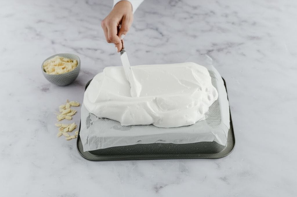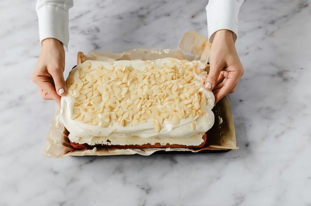 Białka ubijamy z cukrem na sztywną pianę. Pod koniec ubijania wsypujemy mąkę ziemniaczaną i znów ubijamy. Formę wykładamy papierem do pieczenia. Ubitą pianę przekładamy na papier i dokładnie rozprowadzamy. Posypujemy płatkami migdałowymi. Bezę pieczemy w temperaturze 120-130°C około 1 h. Studzimy w piekarniku.