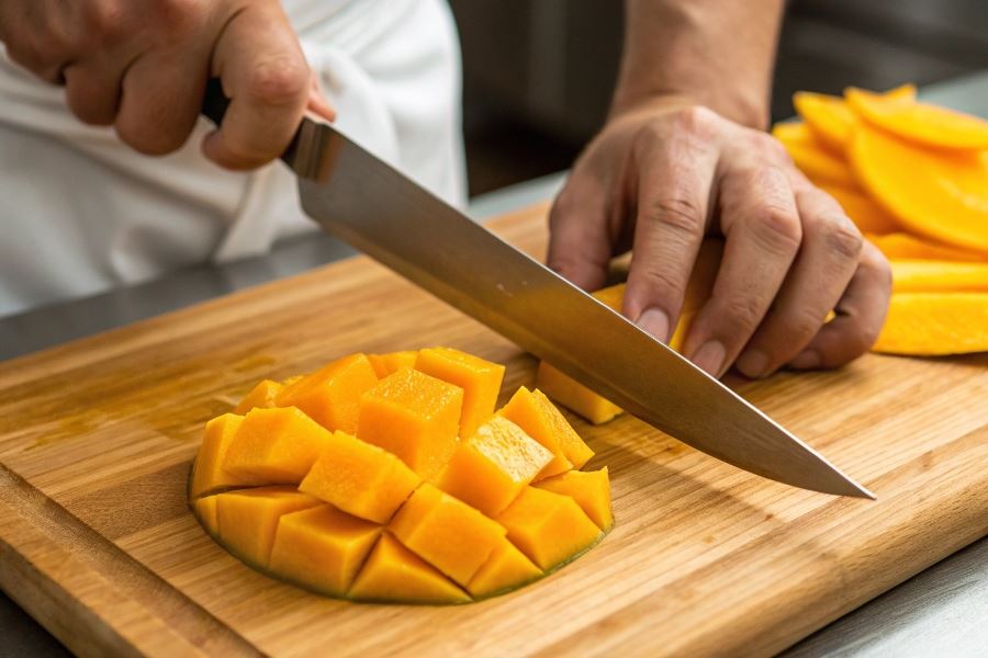 Krojenie mango w kostkę to elegancka technika, która pozwala na szybkie i efektywne przygotowanie owocu bez zbędnego marnowania miąższu. Kluczem do sukcesu jest prawidłowe ułożenie owocu względem pestki.