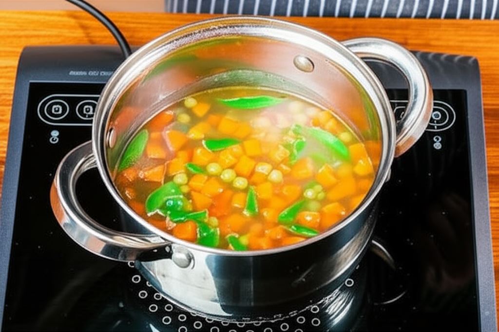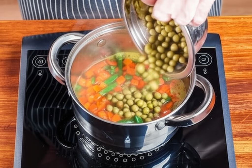 Pokrojoną w kostkę marchew i pokrojoną fasolkę ugotuj w wodzie z Bulionem Knorr aż będą miękkie, pod koniec dodaj groszek.