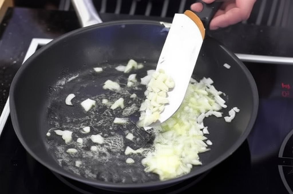 Roztop tłuszcz na patelni i zrumień posiekane czosnek i cebulę.