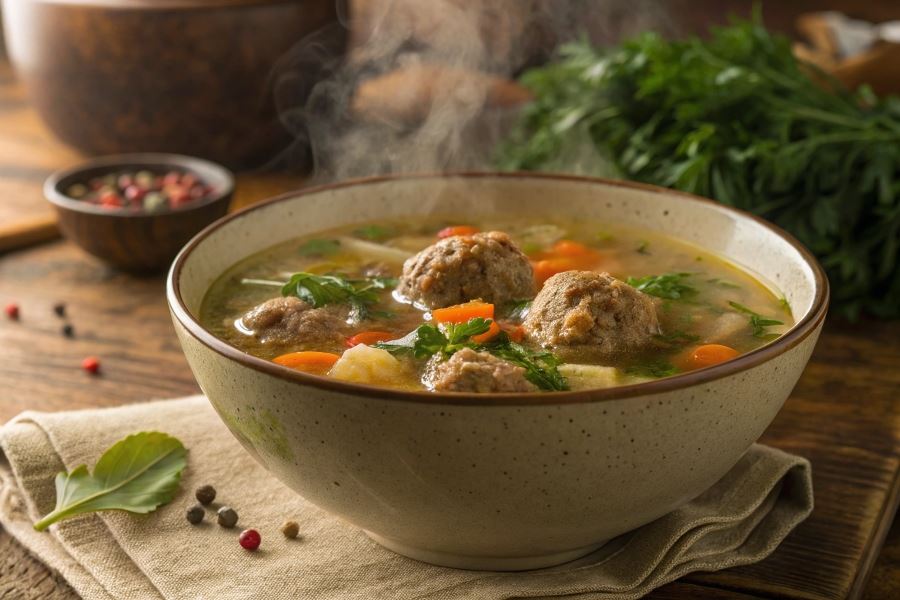 2. Podanie: Umieść ugotowane klopsiki w głębokim talerzu, zalej gorącym bulionem i posyp świeżymi ziołami.