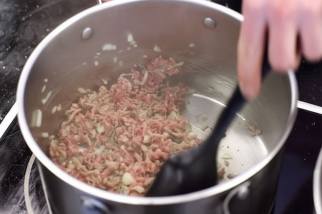Rozpocznij przygotowanie meksykańskiego chili con carne od pokrojenia cebuli w kostkę. Na patelni rozgrzej łyżkę oleju i wsyp do niej cebulę. Podsmażaj ją moment, aż będzie szklista. Następnie dodaj 300 gramów mielonego mięsa wołowo-wieprzowego. Smaż przez kilka minut, dopóki nie zmieni koloru z różowego na jasnobrązowy. Mieszaj mięso, by nie utworzyło grudek.
