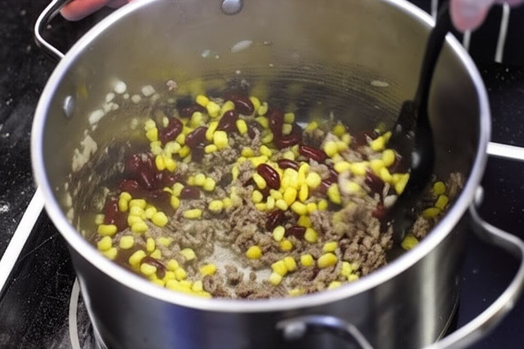 Odcedź 120 gramów czerwonej fasolki oraz 100 gramów kukurydzy z konserwy. Możesz wykorzystać do tego cedzak. Opłucz warzywa pod bieżącą wodą, po czym dodaj je na patelnię do smażącego się mięsa.