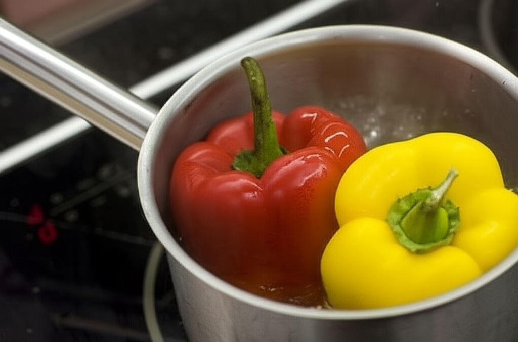 Papryki zanurz we wrzątku na 10 minut, następnie pokrój. Cebulę posiekaj w krążki, pomidory pokrój w kostkę.