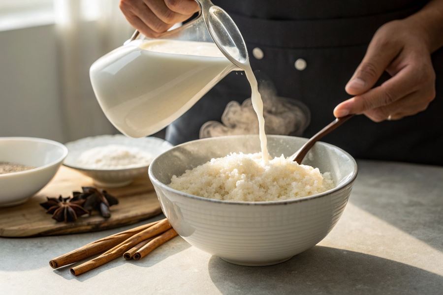 Profesjonalna wskazówka: Dodatki skrobiowe warto wstępnie namoczyć w zimnej wodzie przez 10-15 minut, co skraca czas gotowania i zapobiega zbyt szybkiemu wchłanianiu mleka.