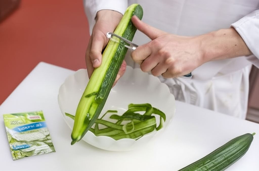 Ogórki opłucz, zdejmij skórkę rozpoczynając od jaśniejszej części w stronę ciemniejszego końca.