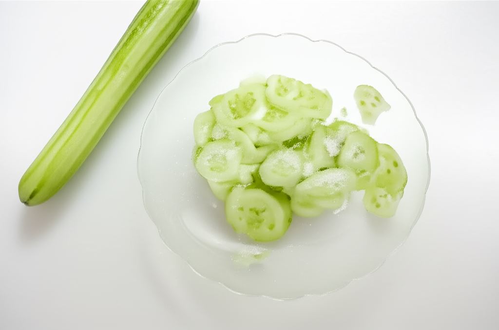 Obrane pokrój w cienkie plasterki i obsyp cukrem. Odstaw na 10 minut. Potem odlej powstały płyn. Ogórki ułóż do salaterek.
