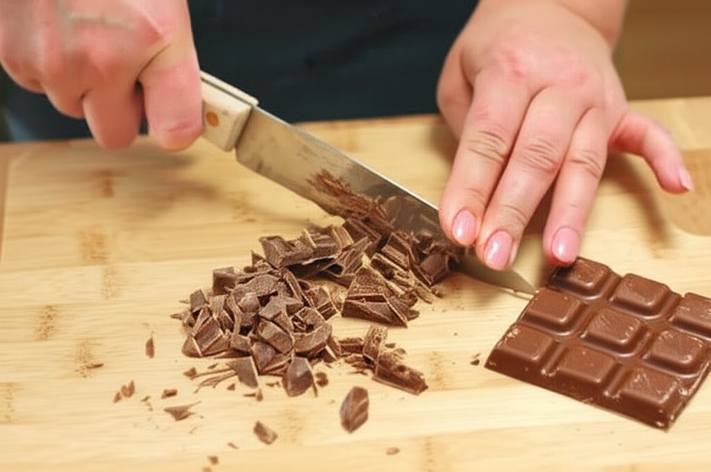 Czekoladę posiekaj nożem, rozdziel na dwie porcje.
