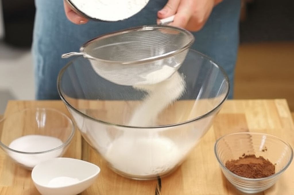 W misce połącz ze sobą przesianą mąkę, cukier, kakao i proszek do pieczenia.