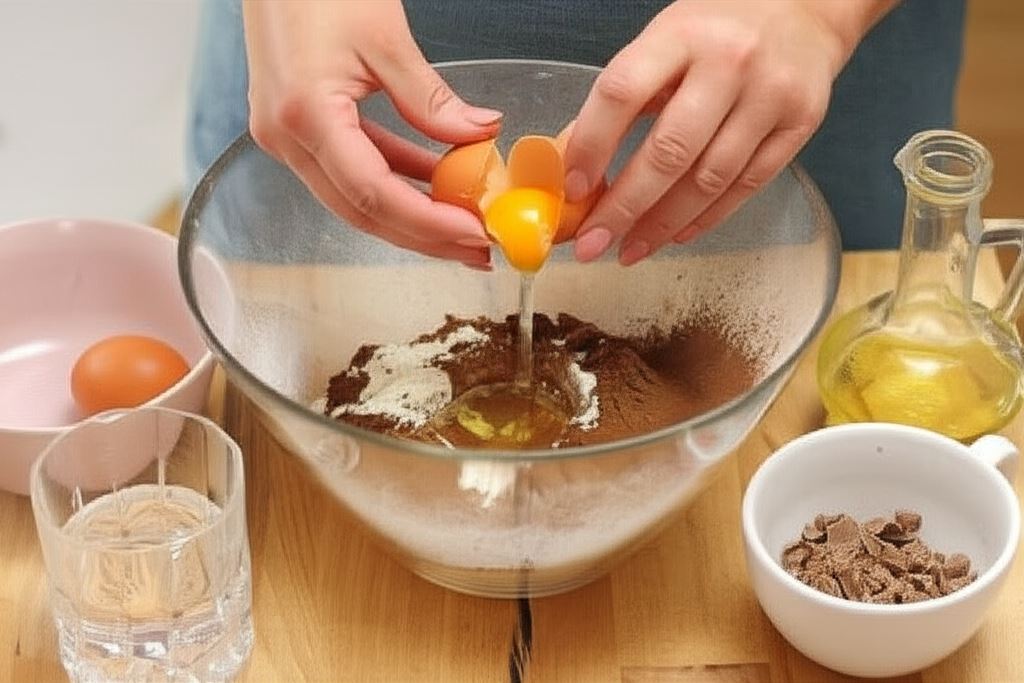 Do suchej mieszanki składników wlej wodę gazowaną, jajka, olej oraz jedną porcję pokruszonej czekolady. Wszystko łagodnie wymieszaj używając trzepaczki.