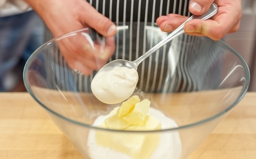 Wymieszaj mąkę z majonezem i masłem. Ciasto szybko wyrób i umieść w zamrażarce. Porządnie schłodzone ciasto rozwałkuj na oprószonej mąką stolnicy. Wytnij koła o rozmiarze foremek do muffinek. Ciastem wyłóż spód foremek. Foremkę z ciastem umieść w lodówce.