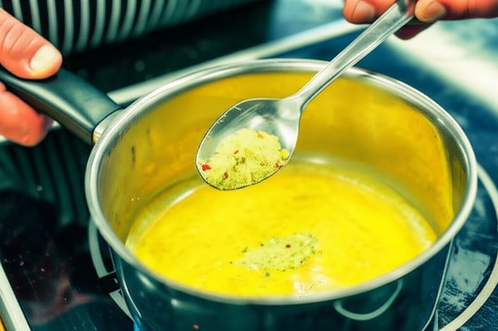 Zagotuj mleko i połącz z przyprawą curry czerwone, rozgniecionym czosnkiem. Odstaw na bok do ostygnięcia, wbij jajka i całość dokładnie wymieszaj.