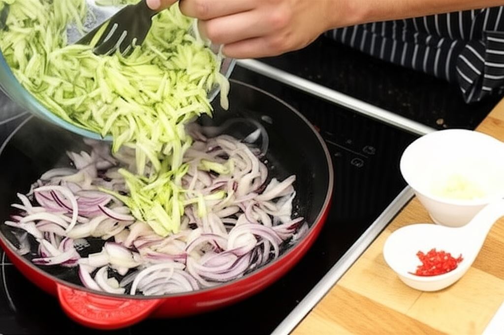 Cukinię opłucz, zetrzyj na tarce. Cebulę pokrój w półplasterki. Startą cukinię razem z cebulą przysmaż na oliwie na patelni, dopraw do smaku posiekanym czosnkiem i ostrą papryką. Warzywa odstaw do wystygnięcia.