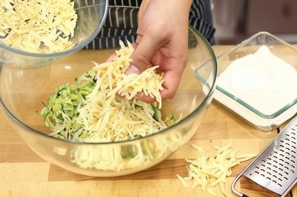 Oscypki zetrzyj na tarce, wymieszaj z warzywami. Wymieszaj mąkę z proszkiem do pieczenia