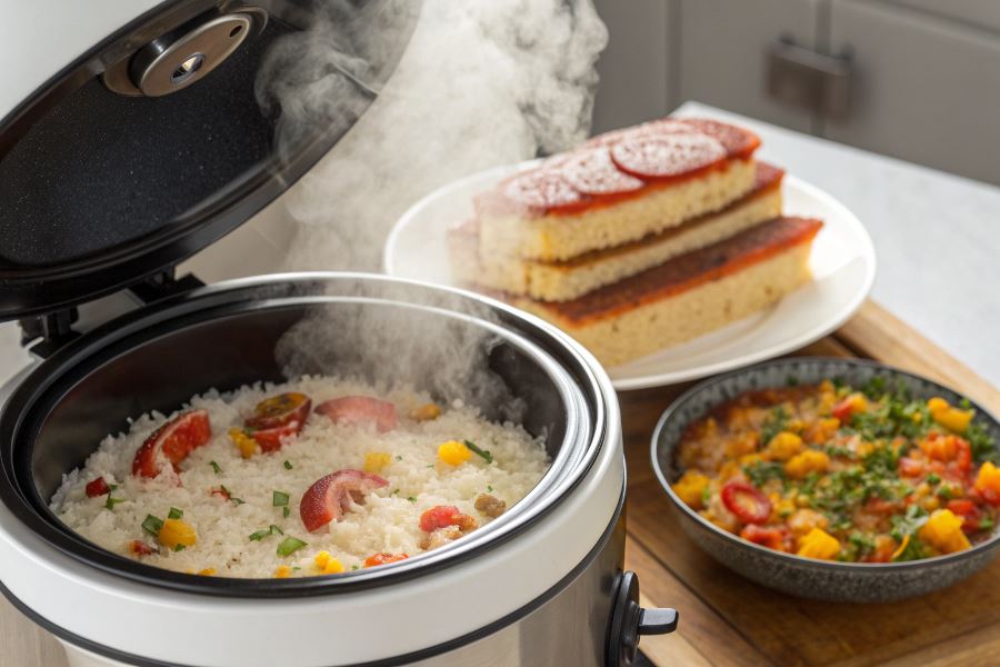 Risotto grzybowe – podsmaż 300 g ryżu arborio z cebulą na funkcji „Smażenie”, dodaj 100 g grzybów, 700 ml bulionu i przyprawy. Przełącz na program „Risotto” lub „Ryż” na 20 minut.