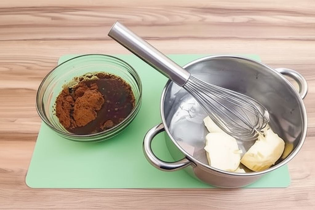 Uruchomić piekarnik góra/dół 180 C. Formę keksową wysmarować wewnątrz masłem i wyścielić papierem do pieczenia. W rondelku umieścić masło i ogrzewać aż się rozpuści. Wsypać cukier, kakao i dolać wodę. Ogrzewać i mieszać do połączenia składników, nie doprowadzać do wrzenia! Odstawić z ognia, ostudzić.