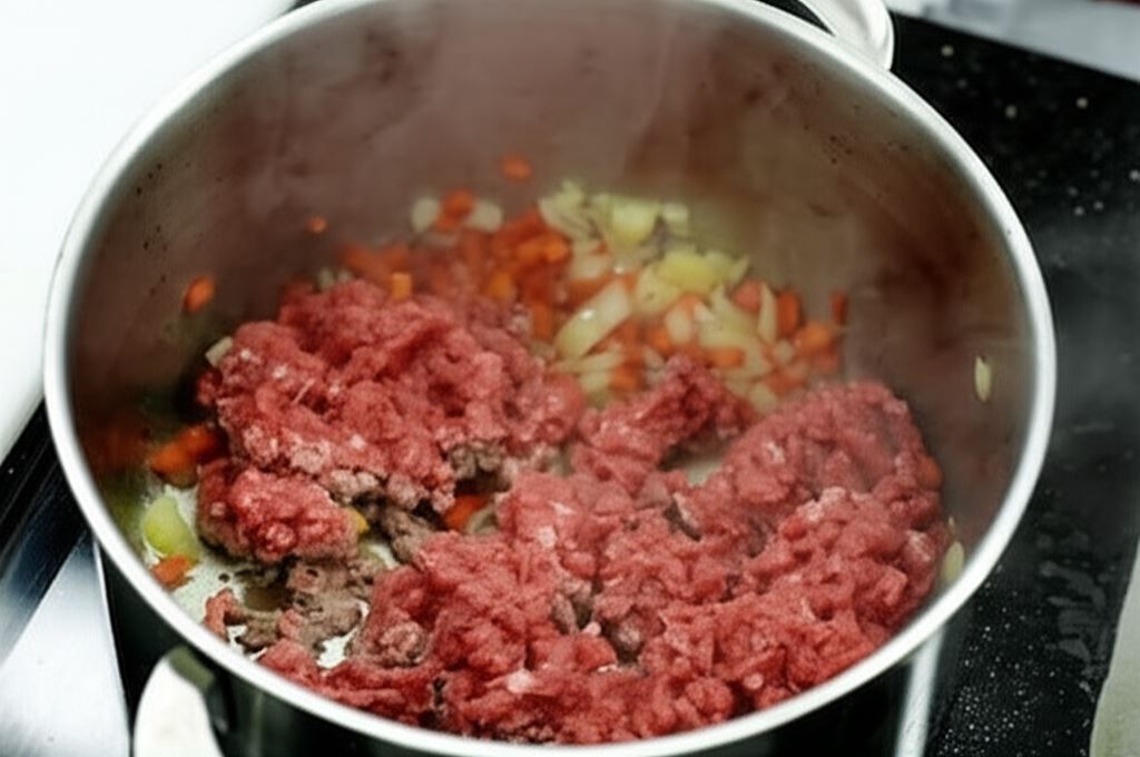 Przyrumień mięso. Paprykę pokrój w kostkę i dorzuć do mięsa.