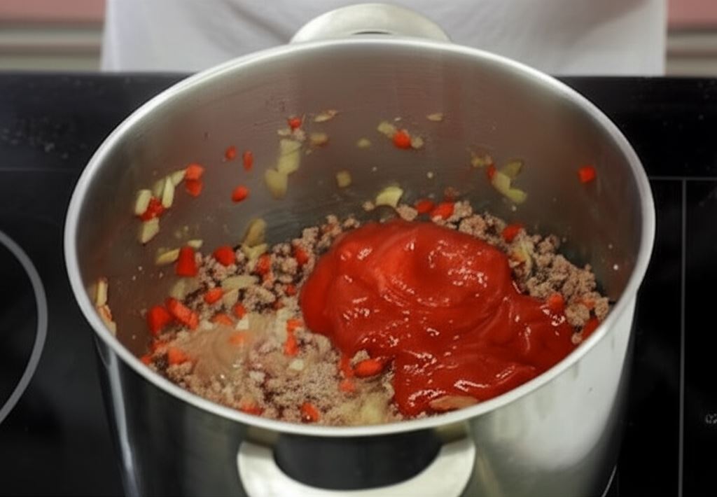 Wlej 2 szklanki wody i Sos w słoiku Spaghetti Bolognese Knorr. Wszystko zamieszaj i doprowadź do wrzenia.