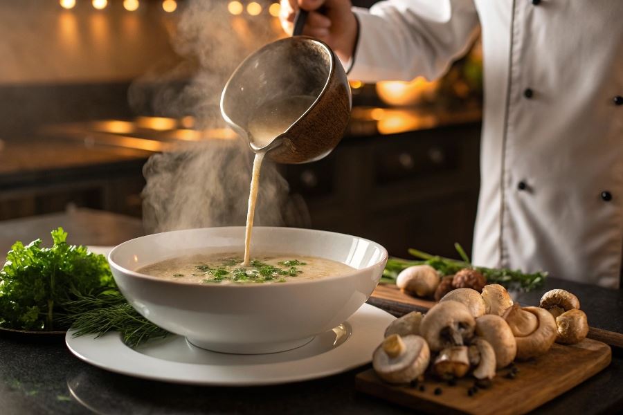 Dekorowanie i serwowanie kremu z pieczarek w restauracyjnym stylu