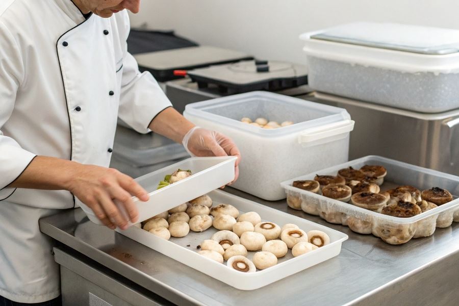 Po wstępnym zamrożeniu grzyby należy przełożyć do pojemników próżniowych lub woreczków strunowych z możliwością usunięcia powietrza. Usunięcie powietrza zapobiega powstawaniu kryształków lodu i chroni przed wysuszeniem. Każde opakowanie powinno być dokładnie oznaczone datą mrożenia oraz nazwą gatunku grzyba. Nowoczesne etykiety termiczne zachowują czytelność nawet w niskich temperaturach.