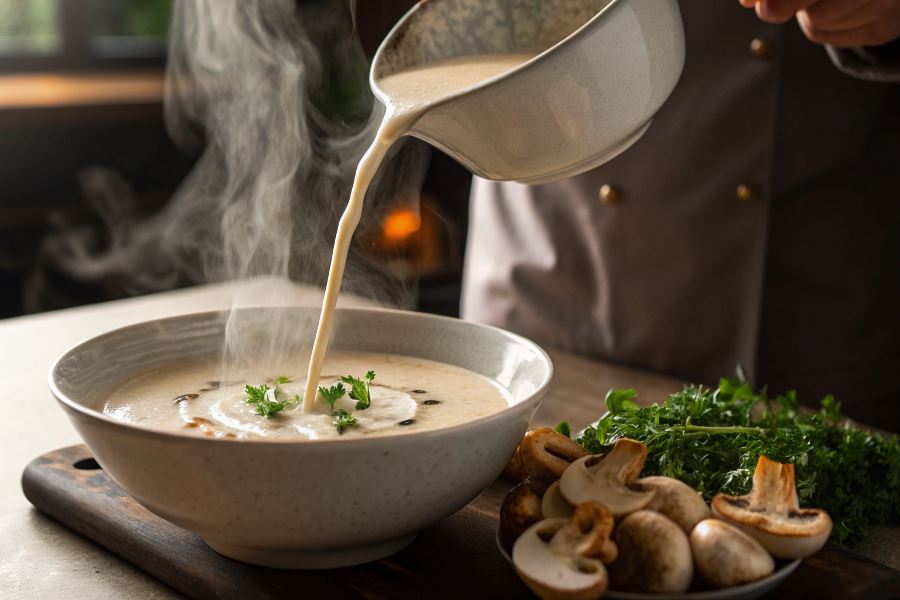 Po zblendowaniu zupa pieczarkowa wymaga odpowiedniego wykończenia. Śmietanka kremówka 30% dodana po zblendowaniu (nigdy podczas) nadaje aksamitności bez ryzyka rozwarstwiania. Alternatywnie można użyć mleka kokosowego dla wersji wegańskiej lub śmietany roślinnej.