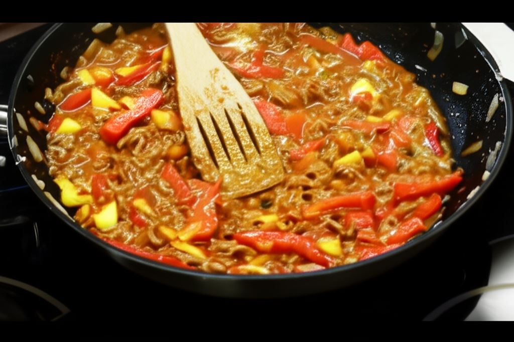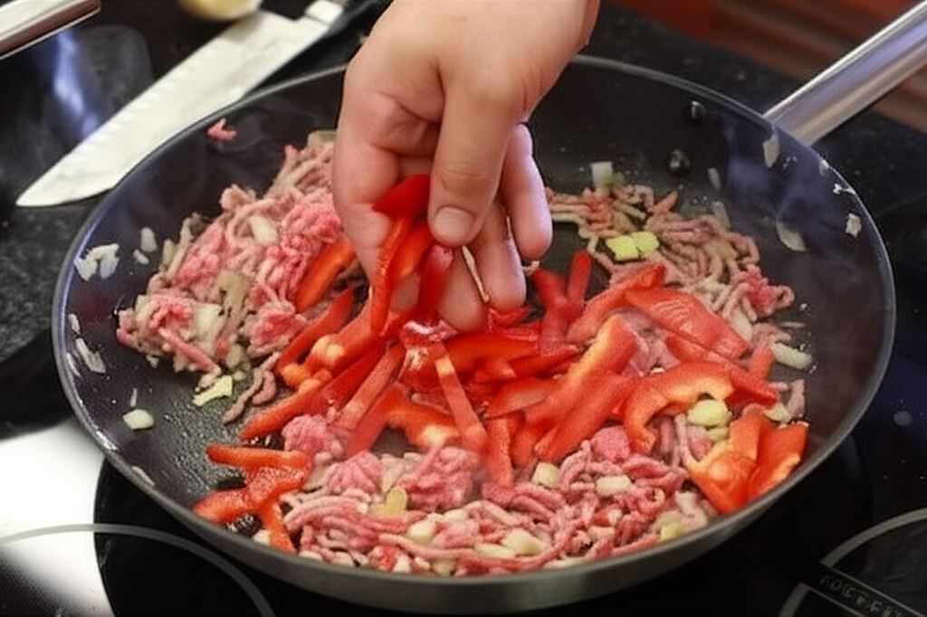 Potem wrzuć mięso, paprykę oraz miąższ cukinii i podduś przez moment.